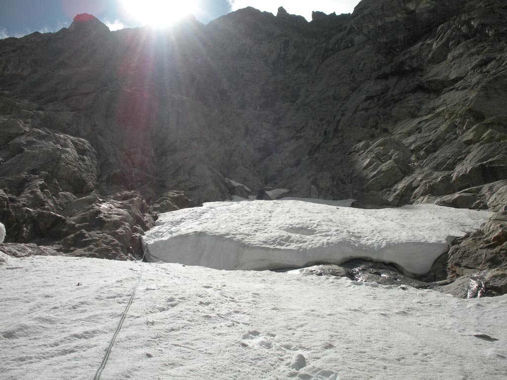Gyors reggeli után indultunk. Innen sem volt könnyebb megtalálni az utat. Továbbra is csak standokban szögek. Jött egy Piola szerinti IV-es hossz, amelyet a másik kalauz V+-nak írt. Ténylegesen legalább V+ vagy VI- lehetett. Itt döntöttük el, hogy sem kondíciónk, sem gyorsaságunk nem elég ahhoz, hogy este a lemeneti úton bivakoljunk a majd fél éves edzés ellenére sem. Közel 9 kg-os zsákokkal nem tudunk ennyi hatost mászni rövid idő alatt. A bivak a csúcs közelében ért volna utol minket (3773 m), és a mínusz 3-4 fok miatt aligha lett volna elkerülhető a fagyás. Úgy döntöttünk ereszkedünk, bele az alattunk már kb. 400 m-esre nőtt falba a 17 kötélhossz után a Punta Bifide-ről.
